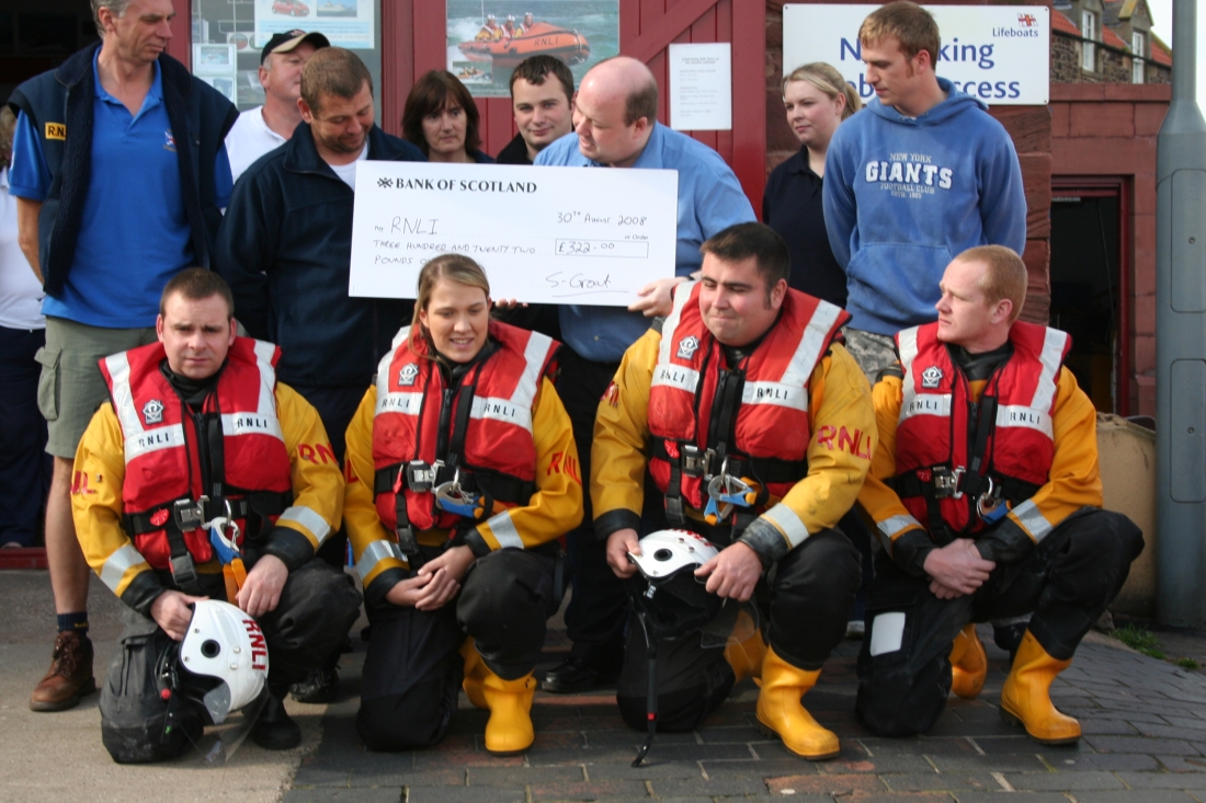 Sean Groat presents a cheque to Dunbar RNLI